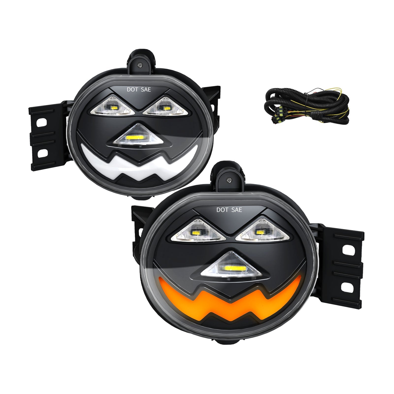 LED fog lights with daytime running lights and an amber turn signal. Create a uniquely "Halloween jack-o'-lantern" look.