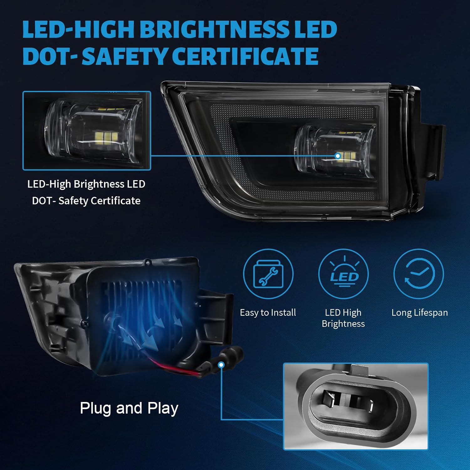 - DOT-Certified: The LED fog lights fit for Toyota 4Runner 2003-2005 are DOT-certified, meeting stringent safety standards that significantly enhance road safety. They feature a high international standard heat dissipation design, ensuring efficient cooling and prolonged lifespan