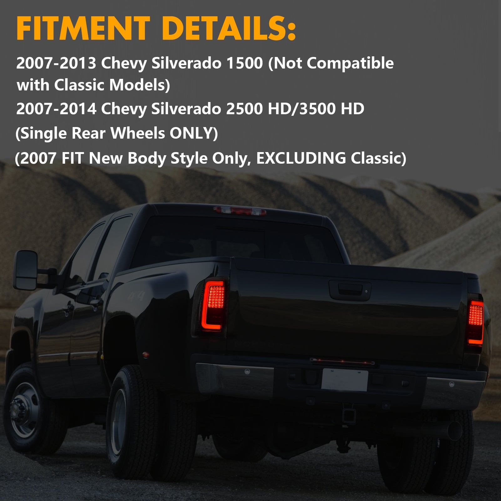2007-2013 Chevy Sliverado 1500 ( Not Fit 2007 Silverado with classic body), 2007-2014 Chevy Silverado 2500HD/3500HD (ONLY Single Rear Wheels) |